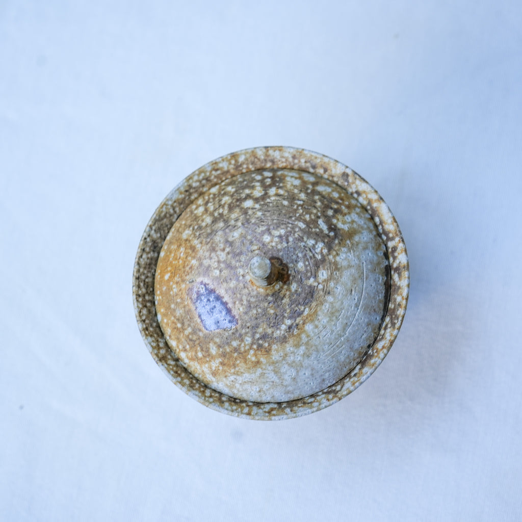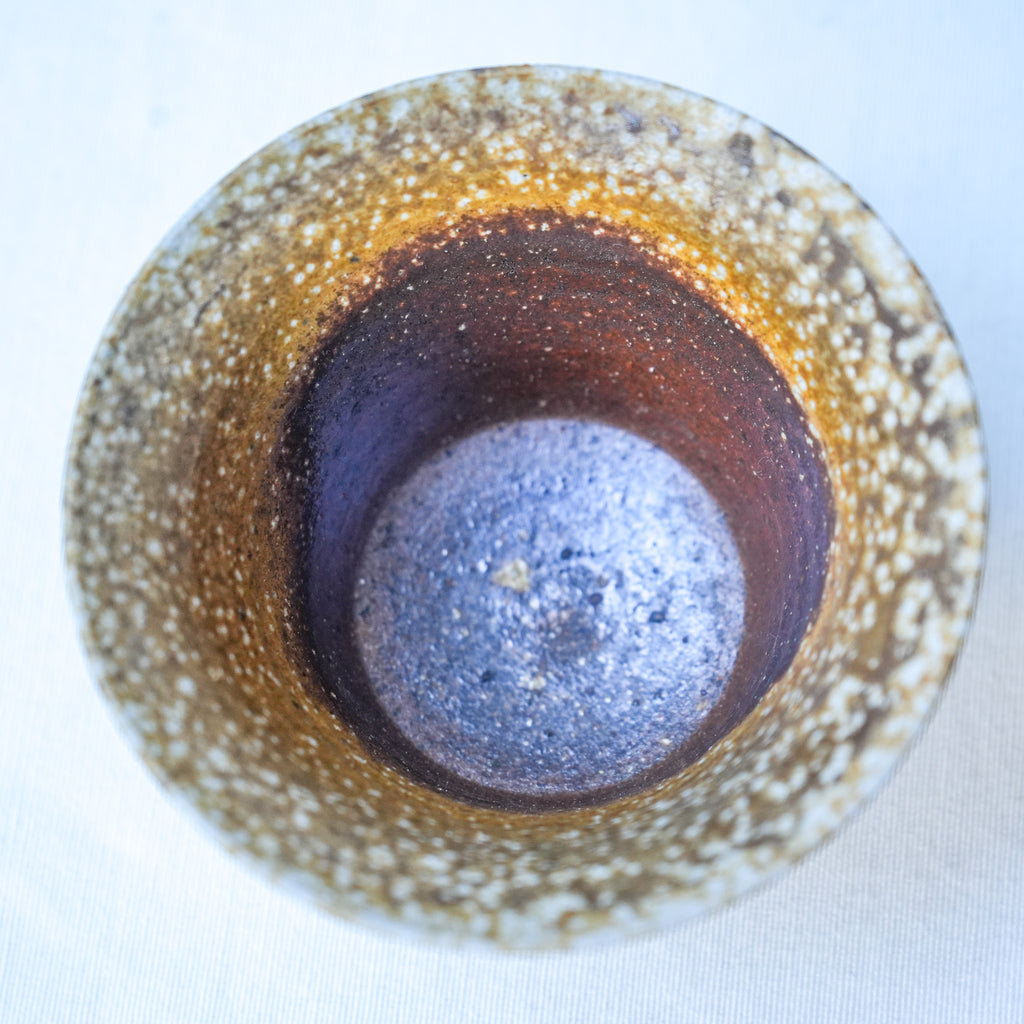 A flared gaiwan with warm golden ash deposits and white mineral spotting across the surface. The firing produced layered textures—soft ochre, ash grey, and warm clay emerging beneath. The clay comes from local Jingdezhen Mid White Clay (中白泥)that allows this versatile expression during firing.